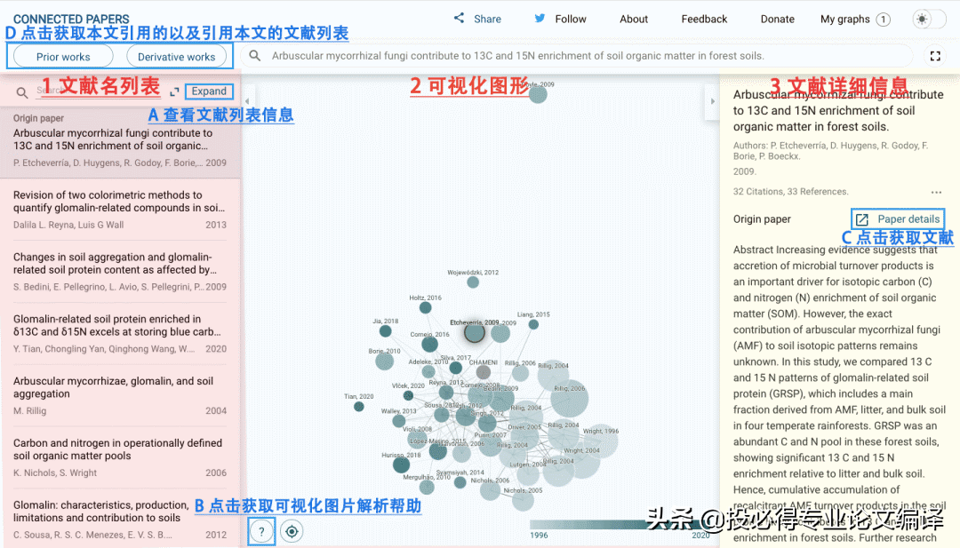 据开发团队介绍,每一幅图都是基于大量文献分析创建的,经过对相关领域成千上万篇文献的分析,选择几十篇与原文献关系最密切的论文供用户阅读。