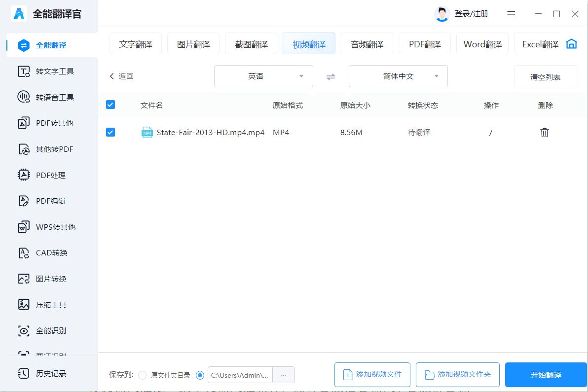 3)在翻译页面中,选择源语言和目标语言,点击“开始翻译”按钮,全能翻译官将自动进行视频翻译。