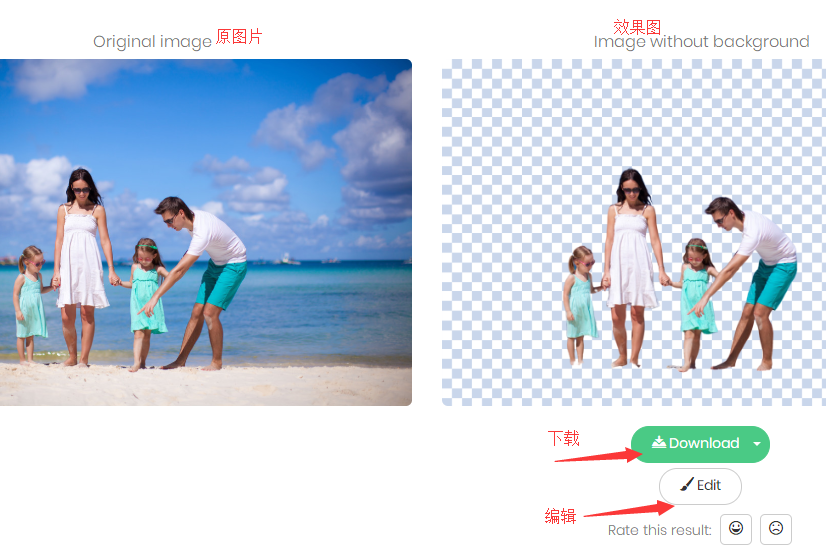 上传图片后即可得到透明图片,你可以选择下载(2种尺寸)或编辑图片再次添加背景