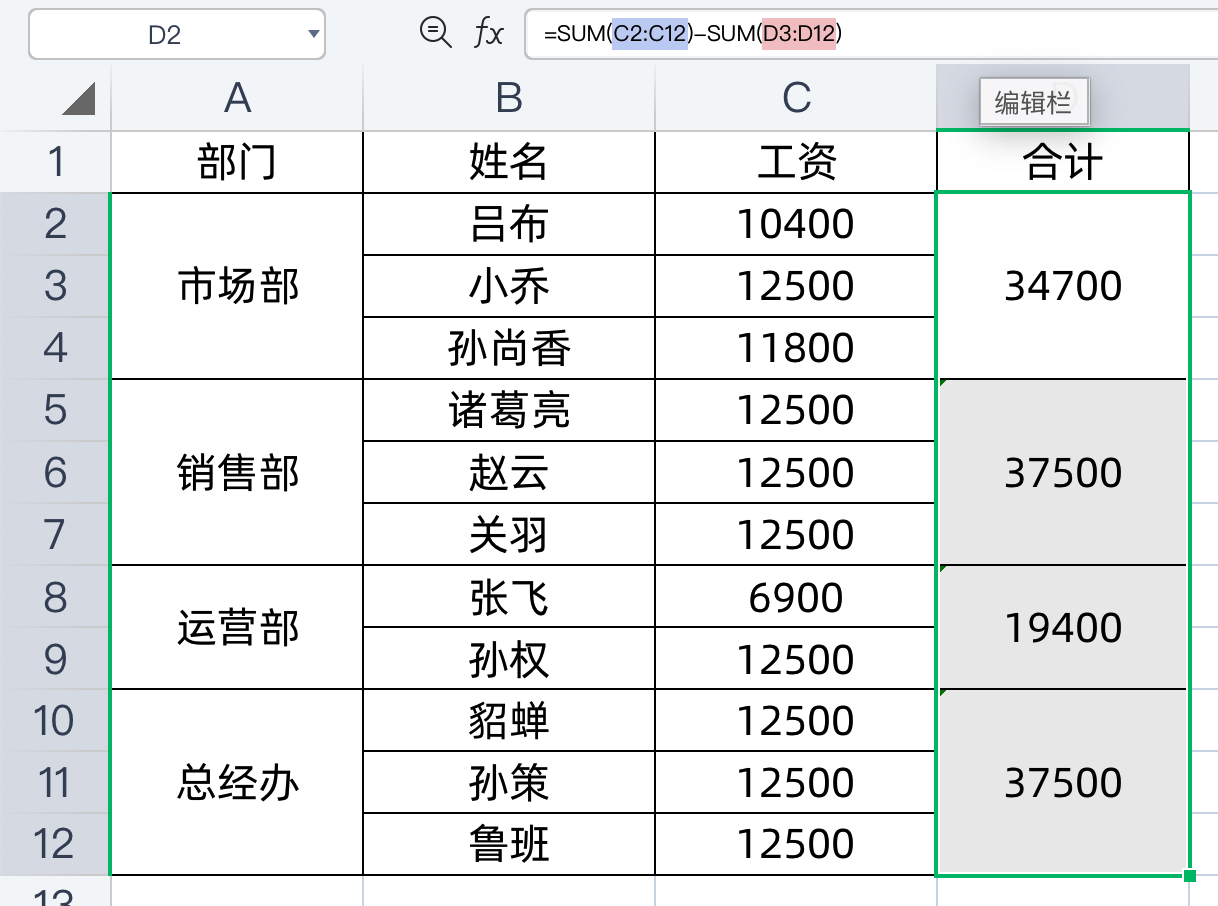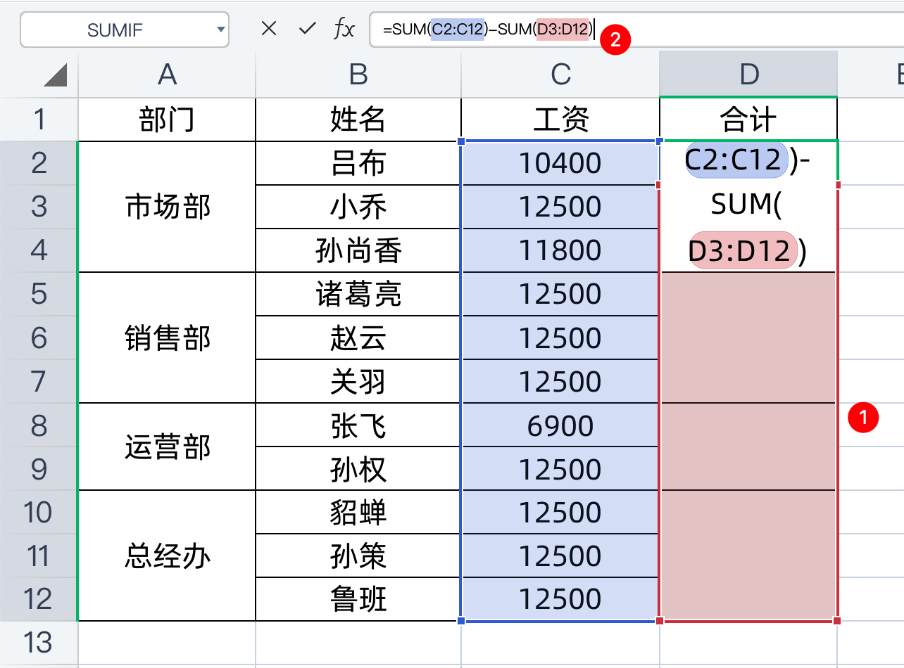 =SUM(C2:C12)-SUM(D3:D12)