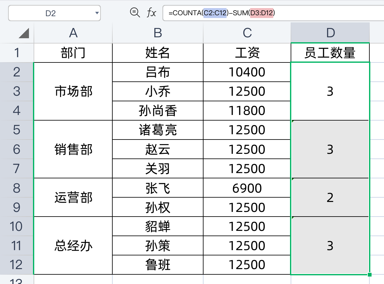 如果会合并单元格求和,那就会计数,只需要把第1个sum公式换成counta公式,就可以对合并单元格计数了,也是需要先选中所有合并区域,然后在公式编辑栏中输入公式:
