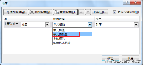 2. 在弹出的对话框中的“排序依据”下拉框中选择“单元格颜色”