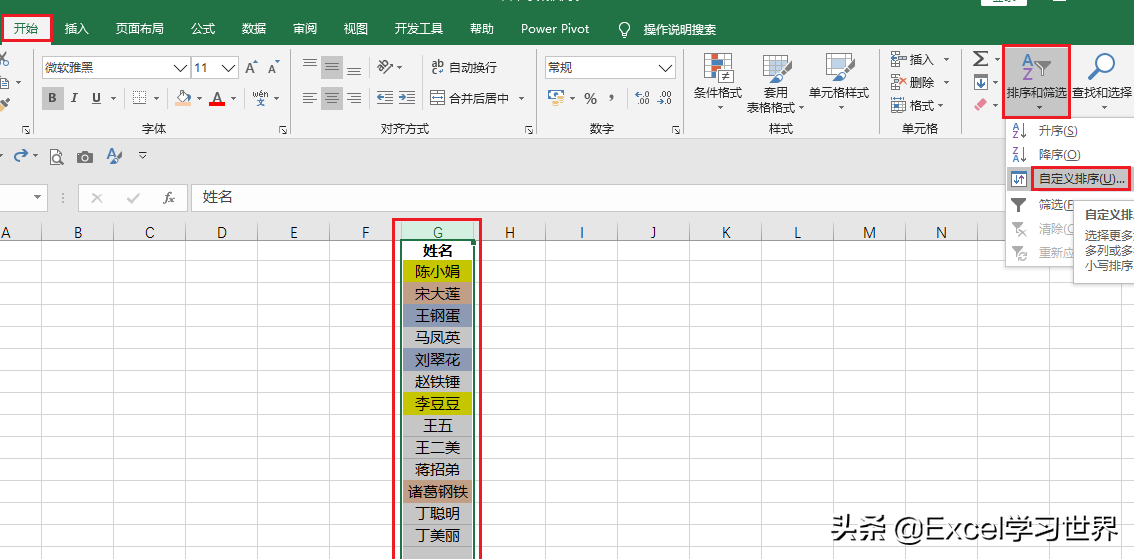 1. 选中 G 列 --> 选择菜单栏的“开始”-->“排序和筛选”-->“自定义排序”