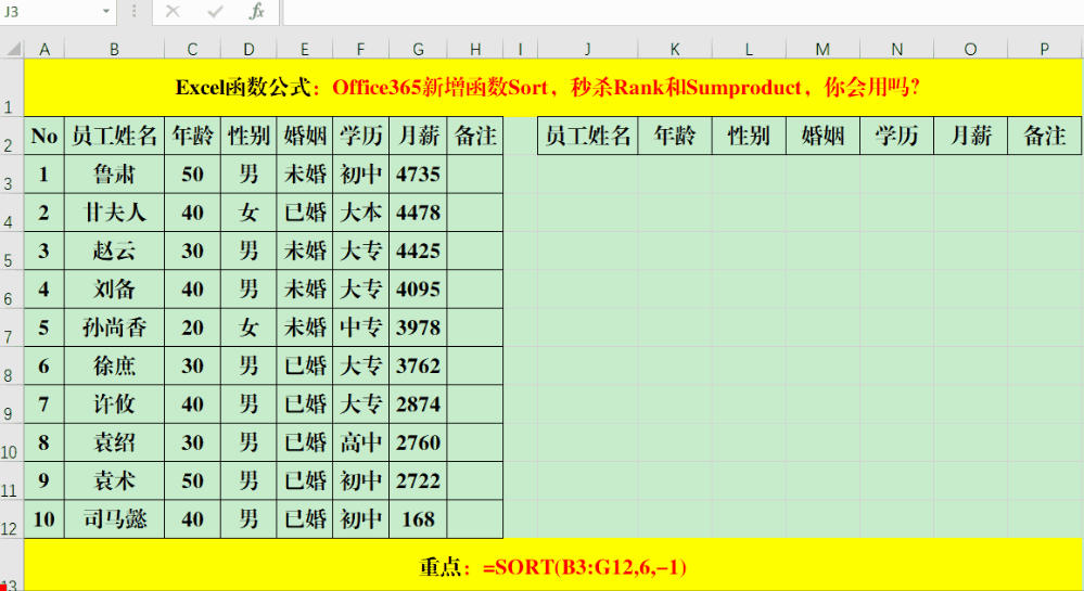 1、公式中的参数“6”指在指定的数据范围B3:G12中,以第6列的值,即“月薪”为主要关键字进行排序。