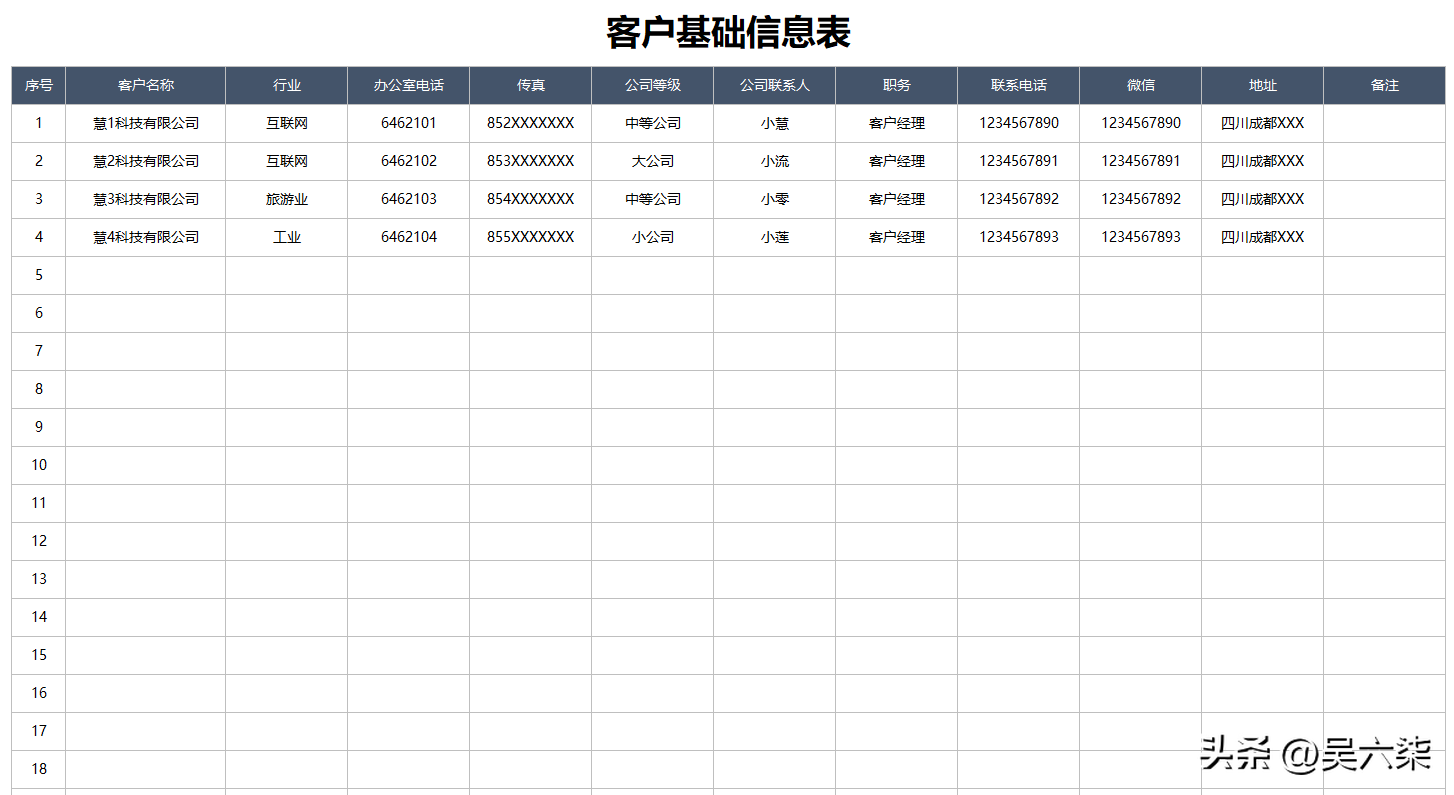 根据前面的客户等级划分表,我们可以登记客户的基础信息,不至于遗忘或者丢失,也有利于后期的开展跟进工作,这可以指引我们接下来营销的方向。