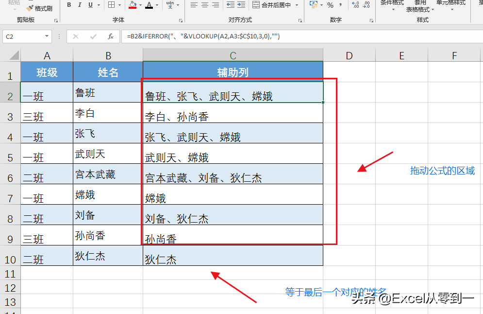 如下图,我们想要将相同班级的姓名放在一个单元格中,首先我们班级对照表后面构建一个辅助列,在里面输入函数:=B2&IFERROR("、"&VLOOKUP(A2,A3:$C$10,3,0),"")然后向下填充到倒数第二个单元格的位置也就是C9单元格,然后在最后一个单元格输入=B10,就是最后一个单元格对应的姓名