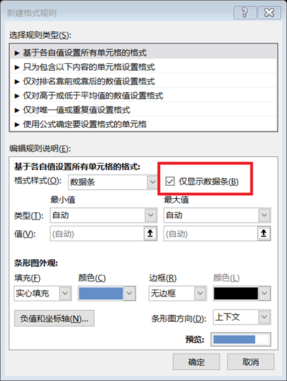 4、 若须去掉数据条内的数据,则按上一步,选择数据条右拉界面最下方的其他规则,会跳出如下界面,勾选仅显示数据条即可!