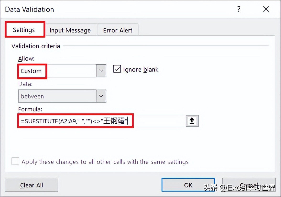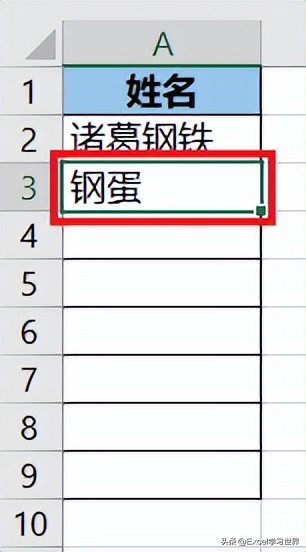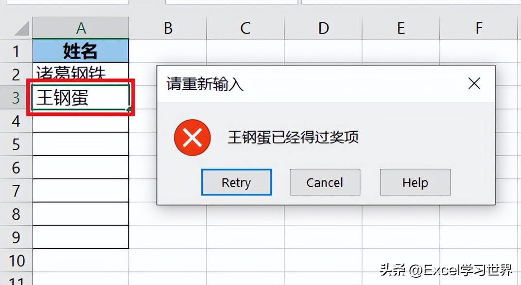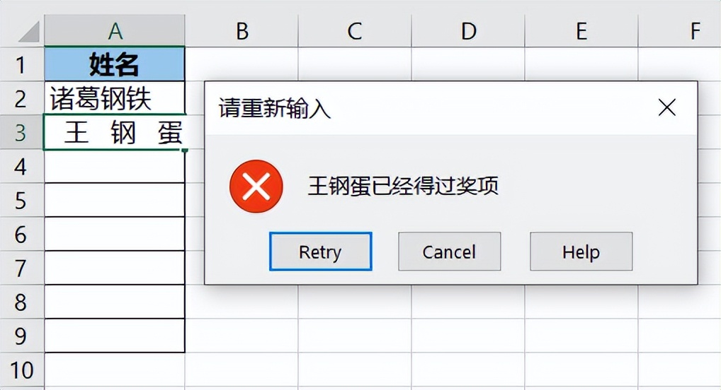 用这个方法设置也有个小漏洞,不知道大家发现没有?如果将“王钢蛋”从其他单元格复制粘贴过来,却不会报错。