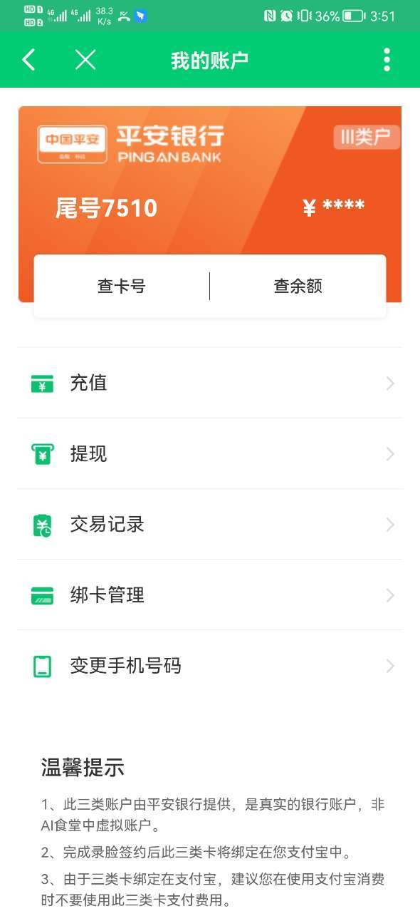 2、【我的账户】平安银行节点下增加了【绑卡管理】和【变更手机号码】功能。