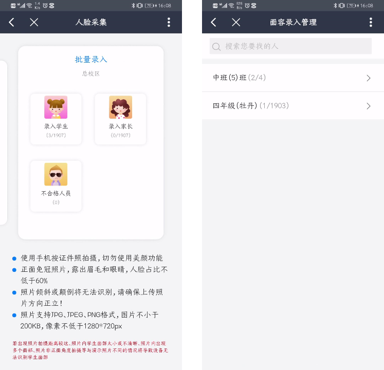 4、新增班主任批量录入功能,班主任可以对任职班级的学生进行人脸录入。