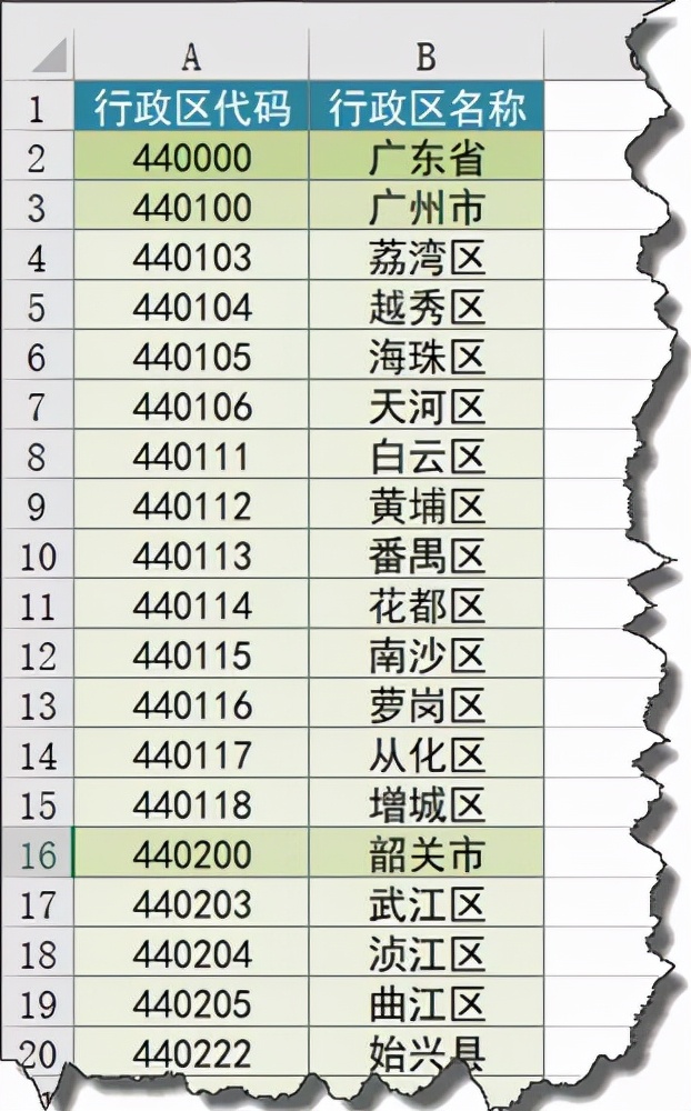 先看下图,A列是行政区代码,B列是对应的行政区名称。