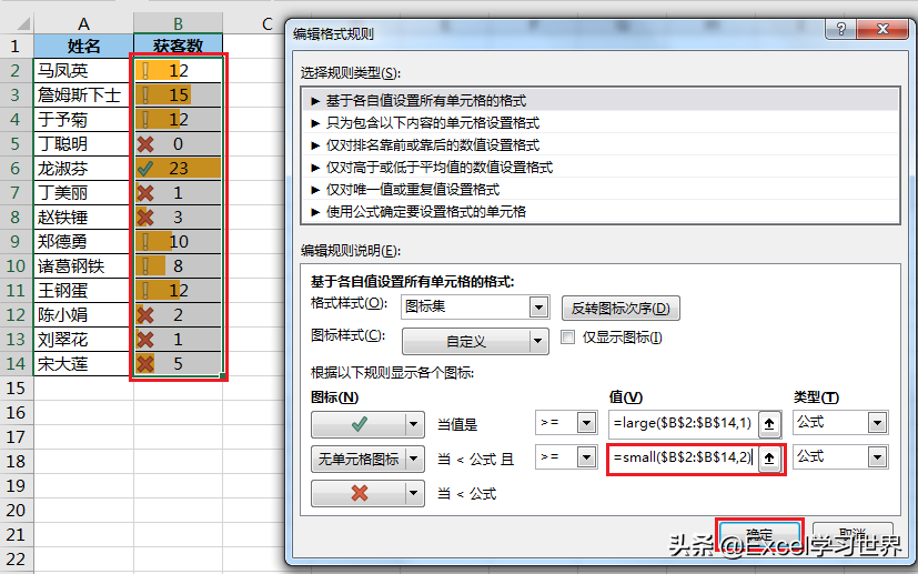 * 为什么找第二小,而不是最小的呢?因为这个公式的结果不是为了控制当前的图标,而是给第三个图标用的;第三个图标的条件时“当<公式”,此处的“公式”指的是第二个图标的公式。比第二小的小,可不就是最小值吗?