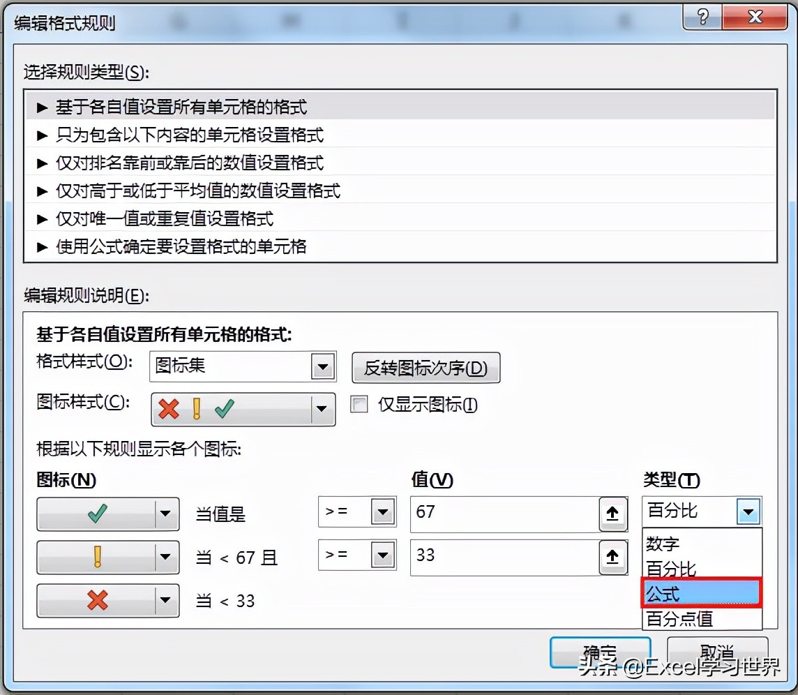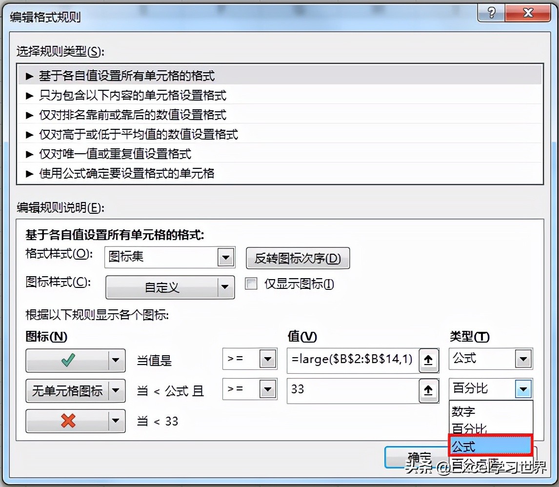 5. 在第一个图标对应的类型下拉菜单中选择“公式”