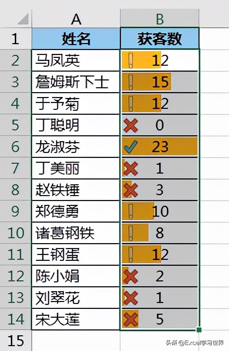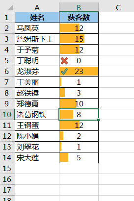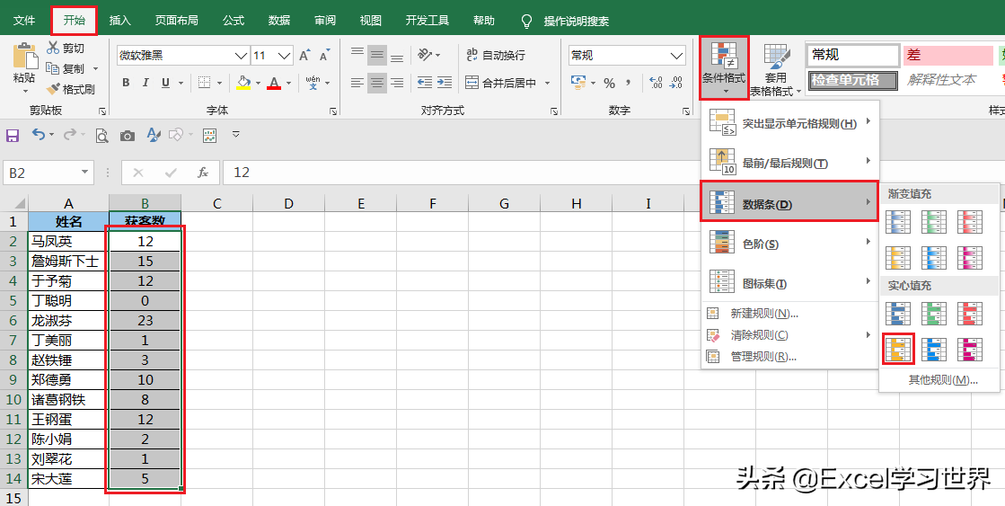 1. 选中 B2:B14 区域 --> 选择菜单栏的“开始”-->“条件格式”-->“数据条”--> 选择所需的数据条颜色