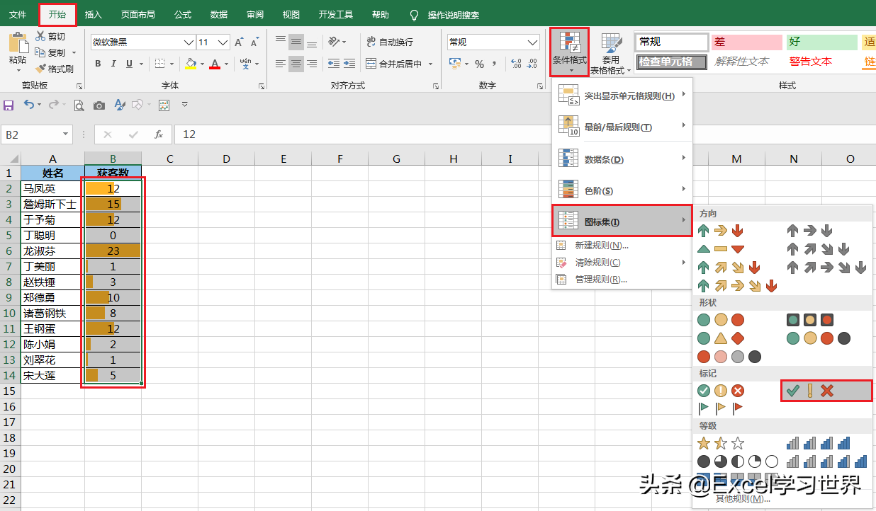 2. 保持选中上述数据表区域 --> 选择菜单栏的“开始”-->“条件格式”-->“图标集”--> 选择所需的图标样式