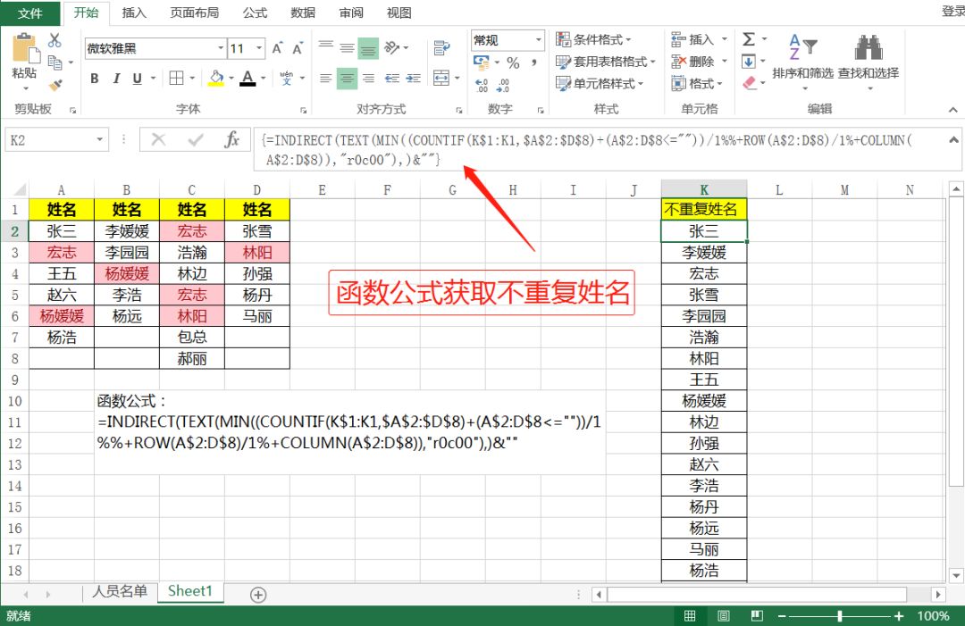 如上图所示,我们需要快速提取单元格区域中,不重复的姓名。许多同学可能在看到数据量比较小的情况下,直接会把所有姓名复制粘贴到一列,然后点击菜单栏:数据—去除重复值来操作。当数据量较大的时候这种方式就比较麻烦,或者有些同学会利用函数组合公式来提取,如下图所示: