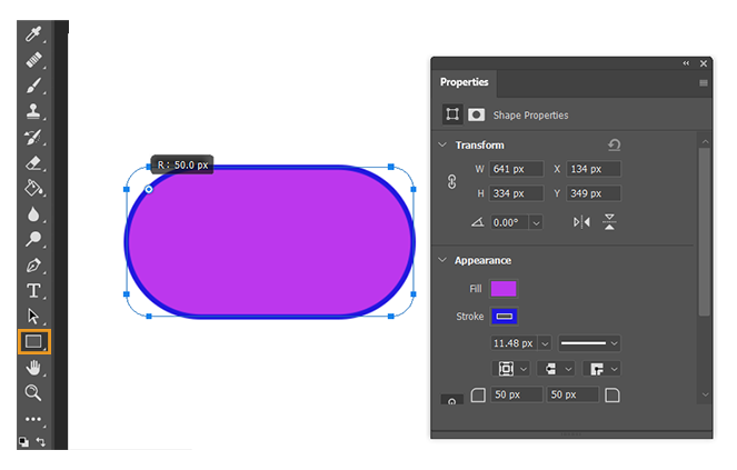 注意:在 2021 年 3 月 版的 Photoshop 22.3 中,已删除圆角矩形工具。但是,您可以轻松使用改进的矩形工具来绘制圆角矩形,该工具提供了通过字段设置圆角半径的功能。