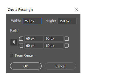 单击画布以显示“创建矩形”对话框。您可以使用此对话框手动设置矩形的尺寸和圆角半径,并选择从中心对齐。单击“确定”可启用更改。将指针放置在画布上并拖动以绘制矩形。这会在“图层”面板中自动创建一个新的图层。