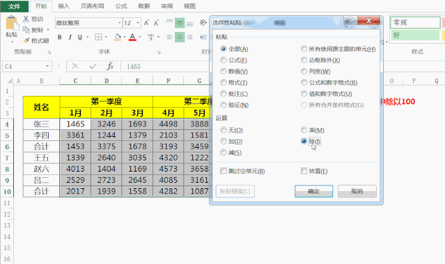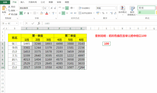 今天我们来学习一种特殊的方式,那就是通过选择性粘贴的方法,不做辅助列、不改变位置的情况下直接对全部数据进行除以100。