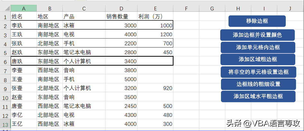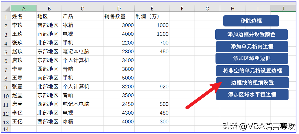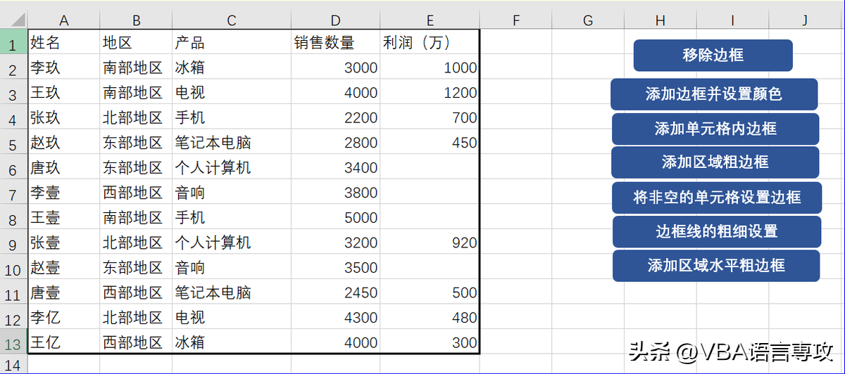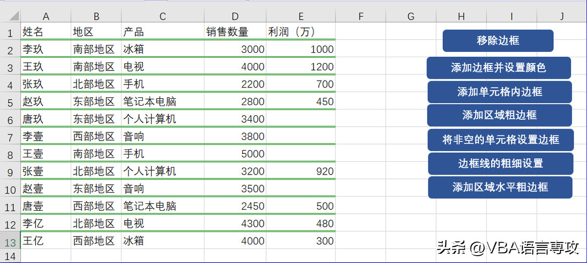 点击按钮后,会在"A1:E13"范围内不同区域设置不同粗细的边框,结果: