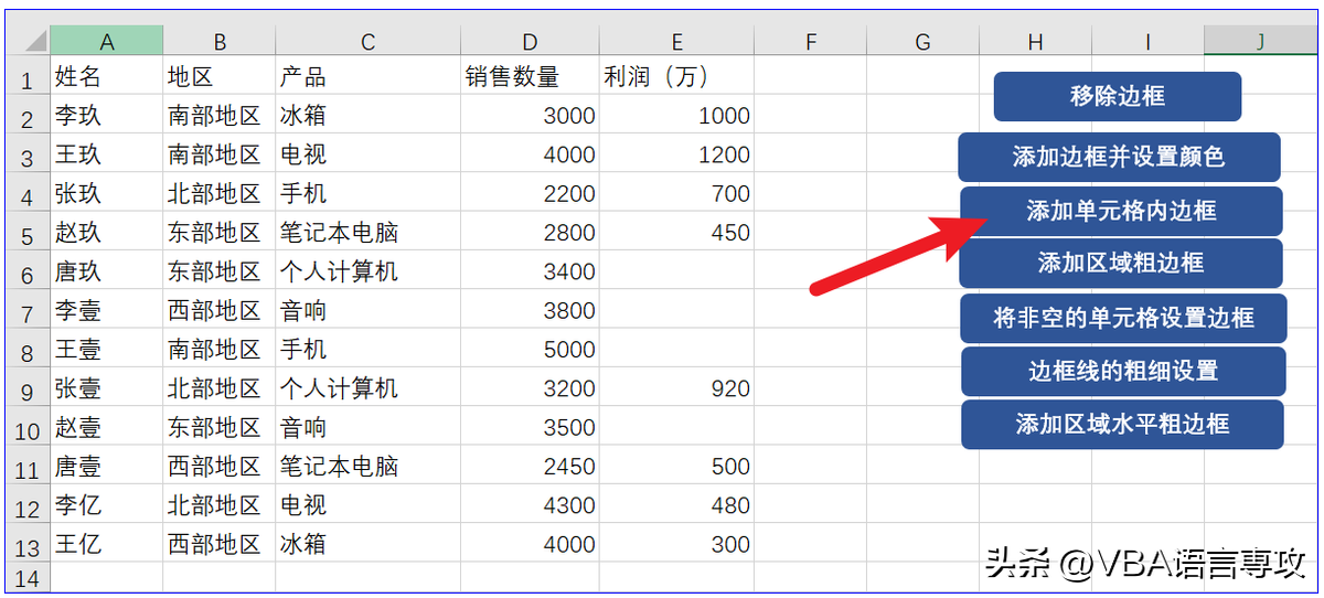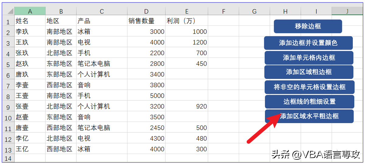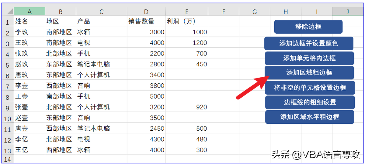 点击按钮后,会在"A1:E13"范围内添加边框并设置颜色,结果: