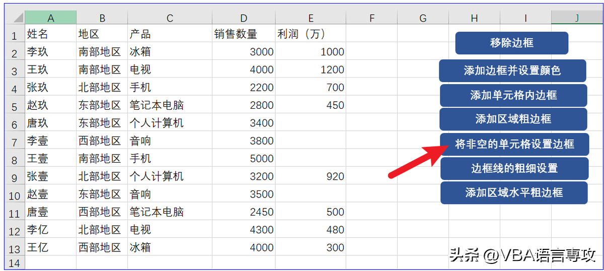 点击按钮后,会在"A1:E13"范围内的非空单元格设置边框,结果: