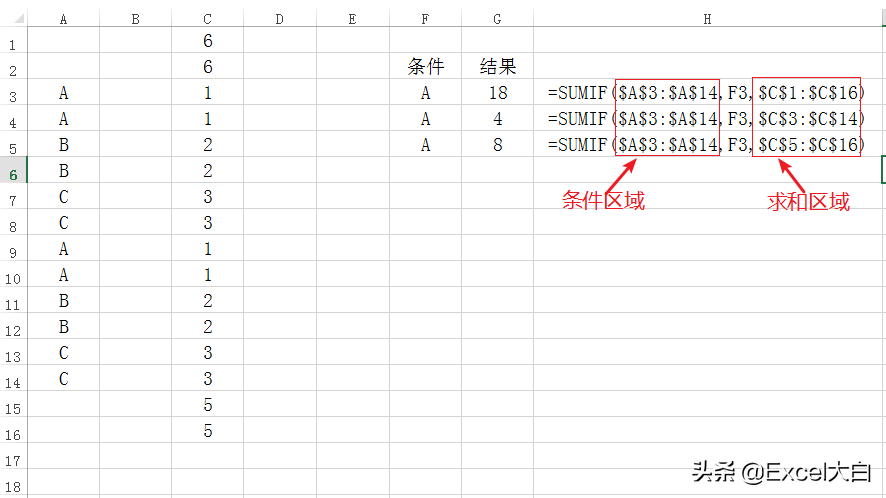 所以呢,在我们下图的公式:=SUMIF($A$3:$A$14,F3,$C$1:$C$16)里面,条件区域的A3单元格对应的是求和区域的C1单元格的数值6,A14单元格对应的是C12单元格,C12单元格后面的数据都被舍弃掉了,那么最后的计算记过就会出现偏差了。
