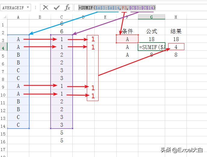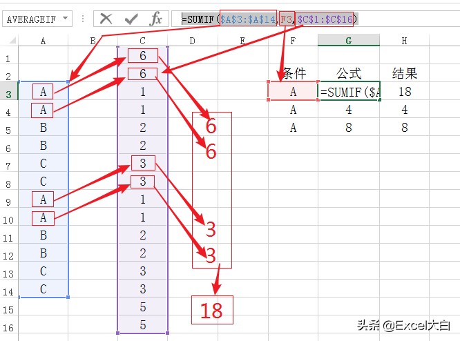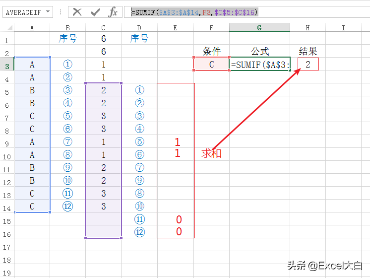 我们再来看看,正确的结果是什么样的。在下图中,我们可以看到因为“条件区域”和“求和区域”是范围是一致的,所以A3对应的单元格就是C3单元格......A14单元格对应的是C14单元格。