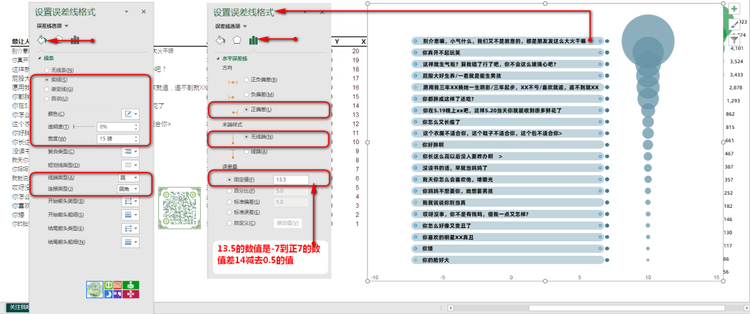 给最左边气泡图添加误差线,删除Y误差线,设置X误差线格式,正偏差,无线端,误差量固定值13.5。13.5是系列3到系列2水平方向的数值差,减去0.5.