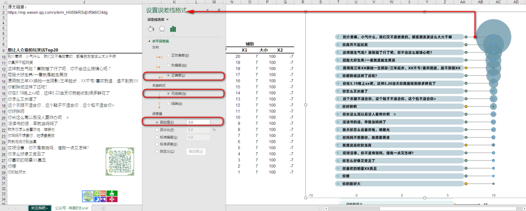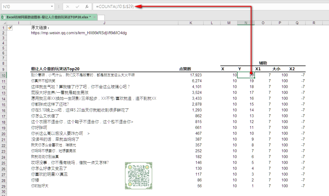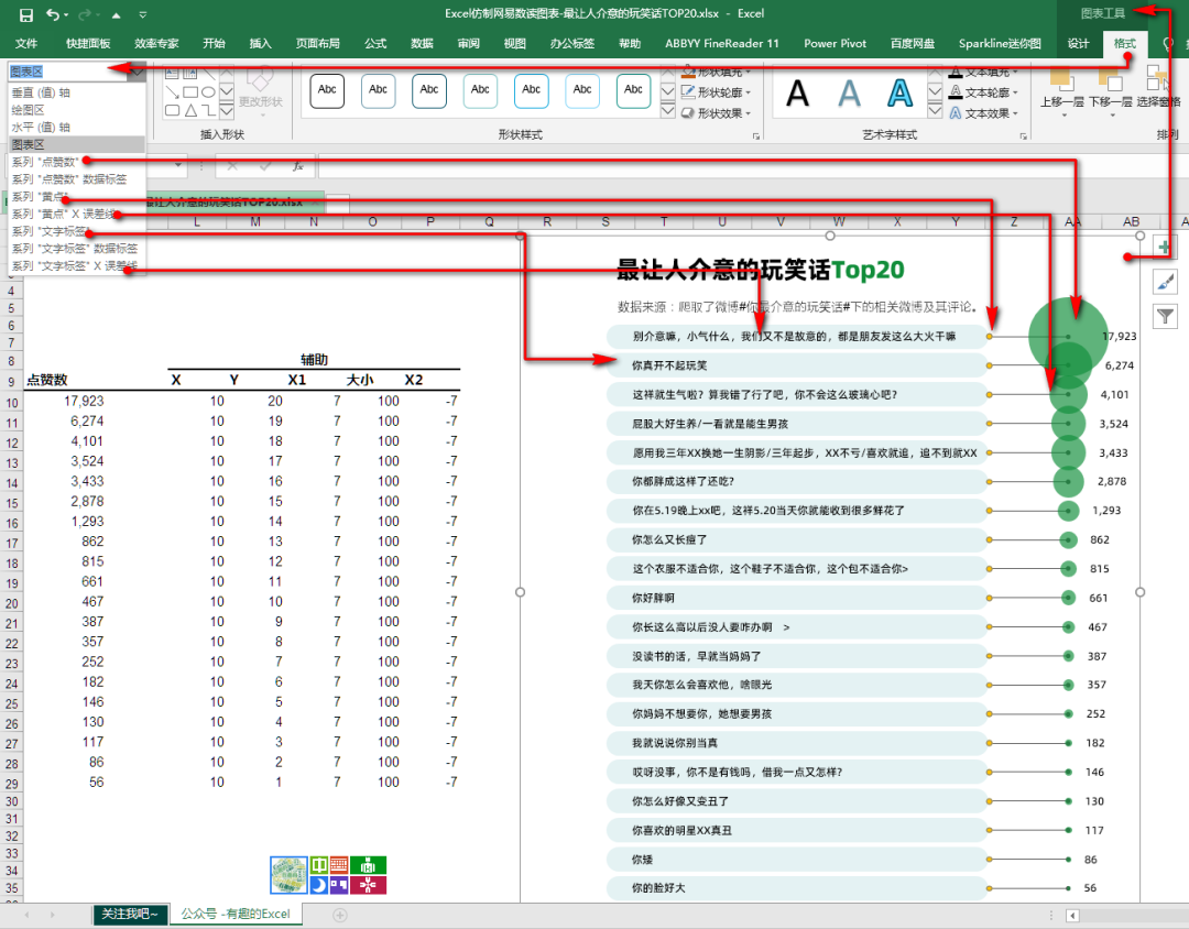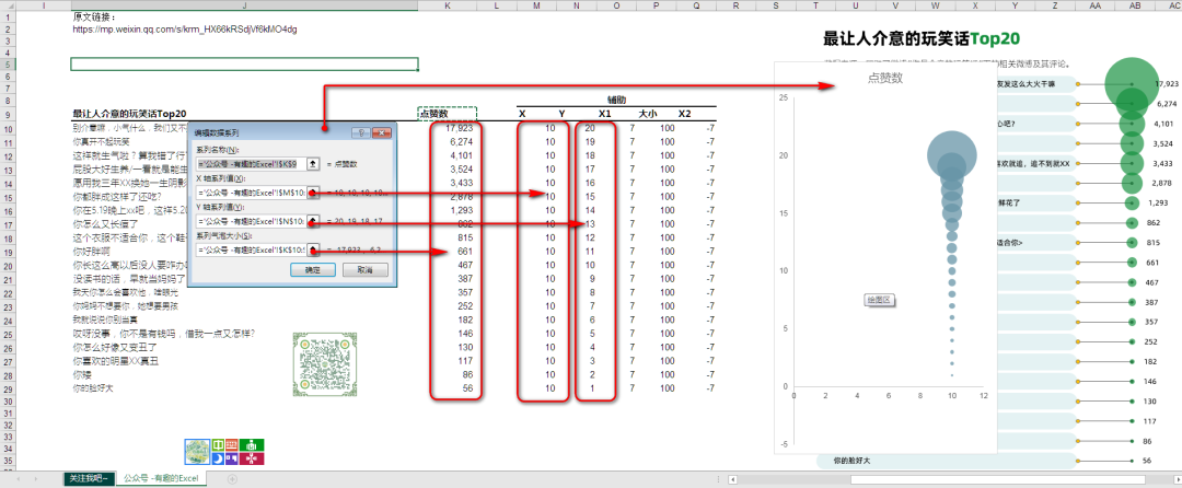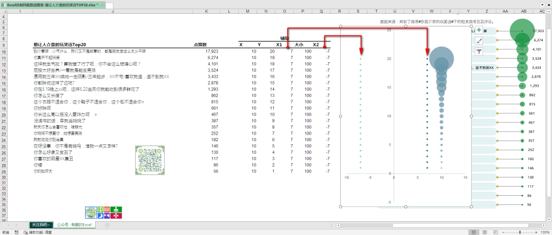 制作过气泡图的读者,都明白,气泡图有3组数值,分别是X,Y轴数值,以及气泡大小的数值。这里我假定气泡是水平轴上的10的位置,由于所有的气泡都在一条线上,所以这里X轴的数据,就是一组都为10的数字,Y轴的数值通过对分类标签的计数而得到,有一个分类标签,就占一个位置,可以通过计数公式=COUNTA(I10:$I$29)计算得到,气泡的大小就是点赞数值了。