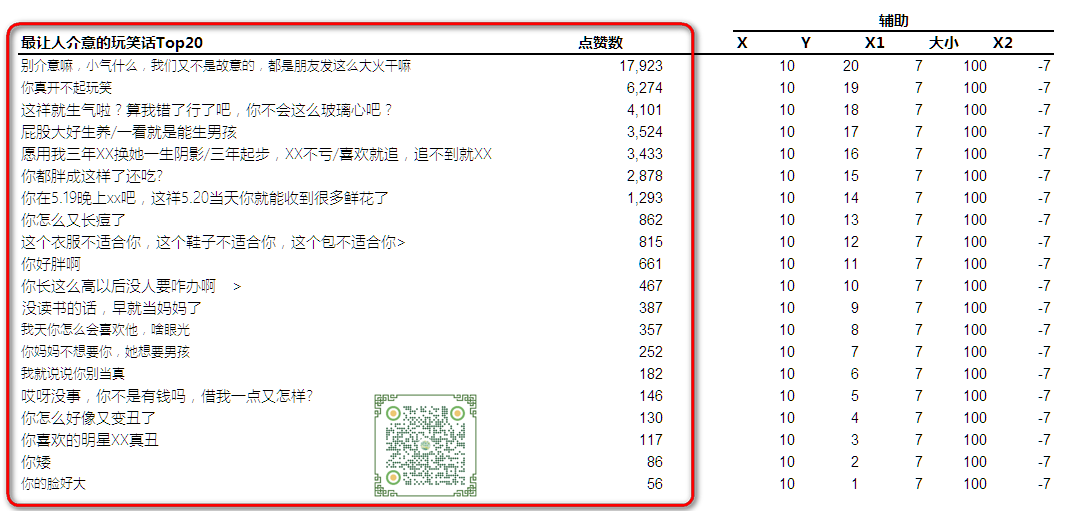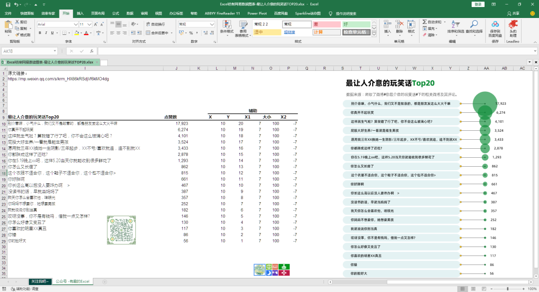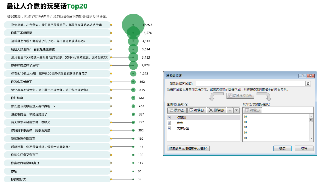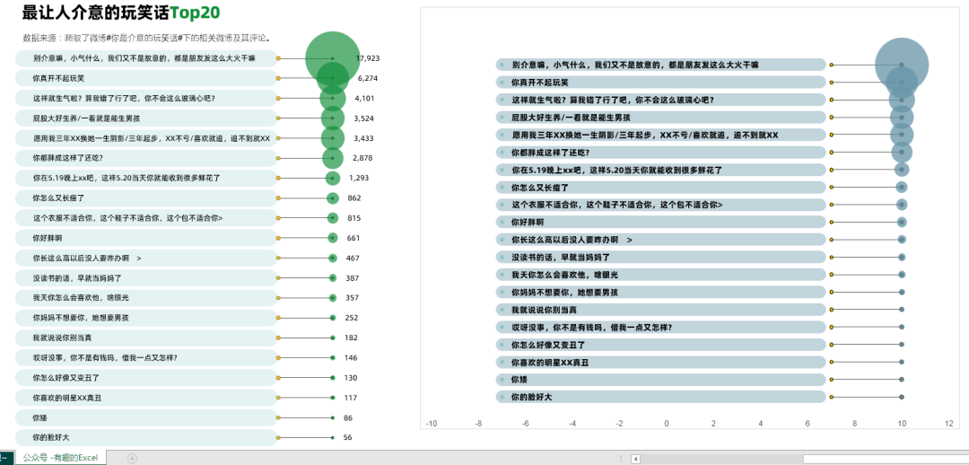 网易数读这个图表,使用了气泡图的方式来展现玩笑话的TOP20,特色在于左边的文字标签。