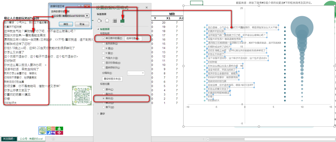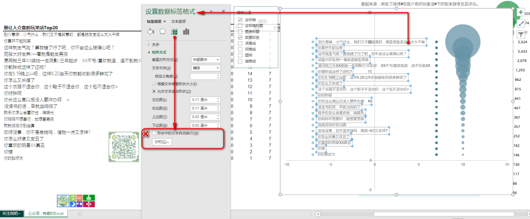 先给最左边的气泡图添加数据标签,同时通过使用指定单元格中值,从而替换数据标签的显示内容。