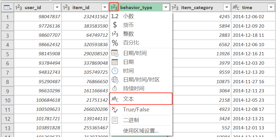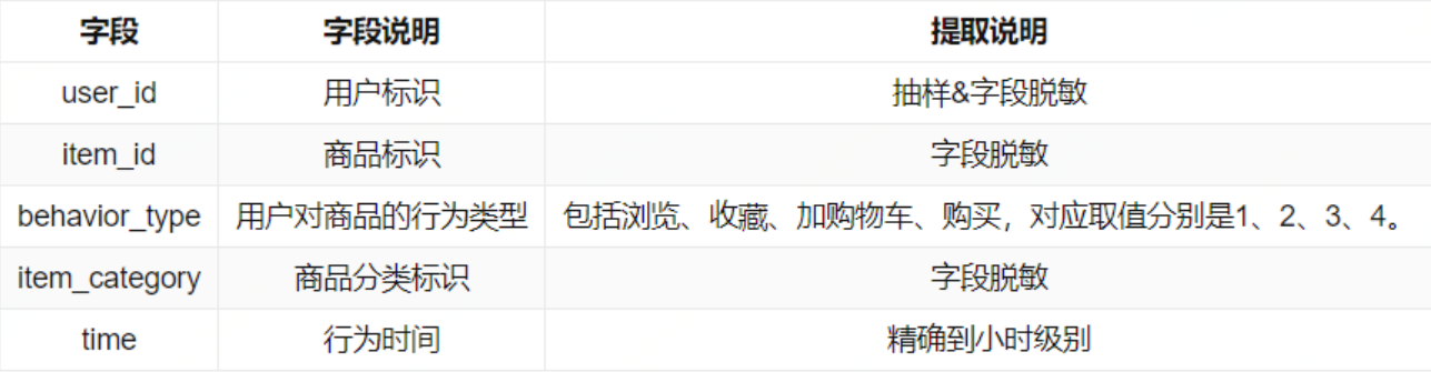 本节会用一种数据处理方法来处理这种大文本数据,如下的用户行为数据共包含用户标识、商品标识、用户对商品的行为、商品分类标识、行为时间共计五个字段,要研究每个用户对商品的行为转化情况。