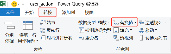 数据类型转化后,可以将具体的用户行为数字标识替换为具体的用户行为,在数据选项卡下点击替换值。