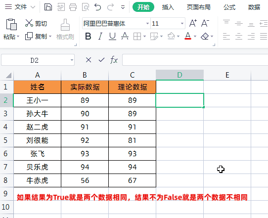 后面的辅助列第一个单元格输入公式=B2=C2,然后下拉填充剩下的数据,如果结果为True就是两个数据相同,结果不为False就是两个数据不相同。