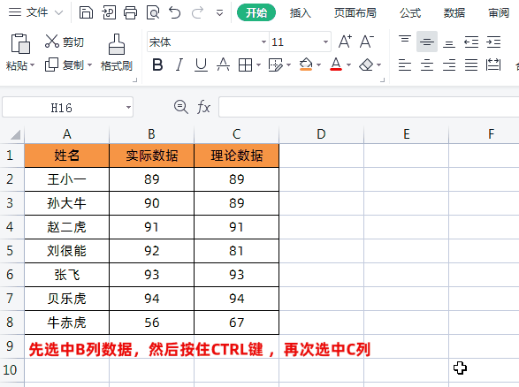 1、我们先选中B列数据,然后按住CTRL键 ,再次选中C列,这样把两列要核对的数据就全部选中了,如下图所示