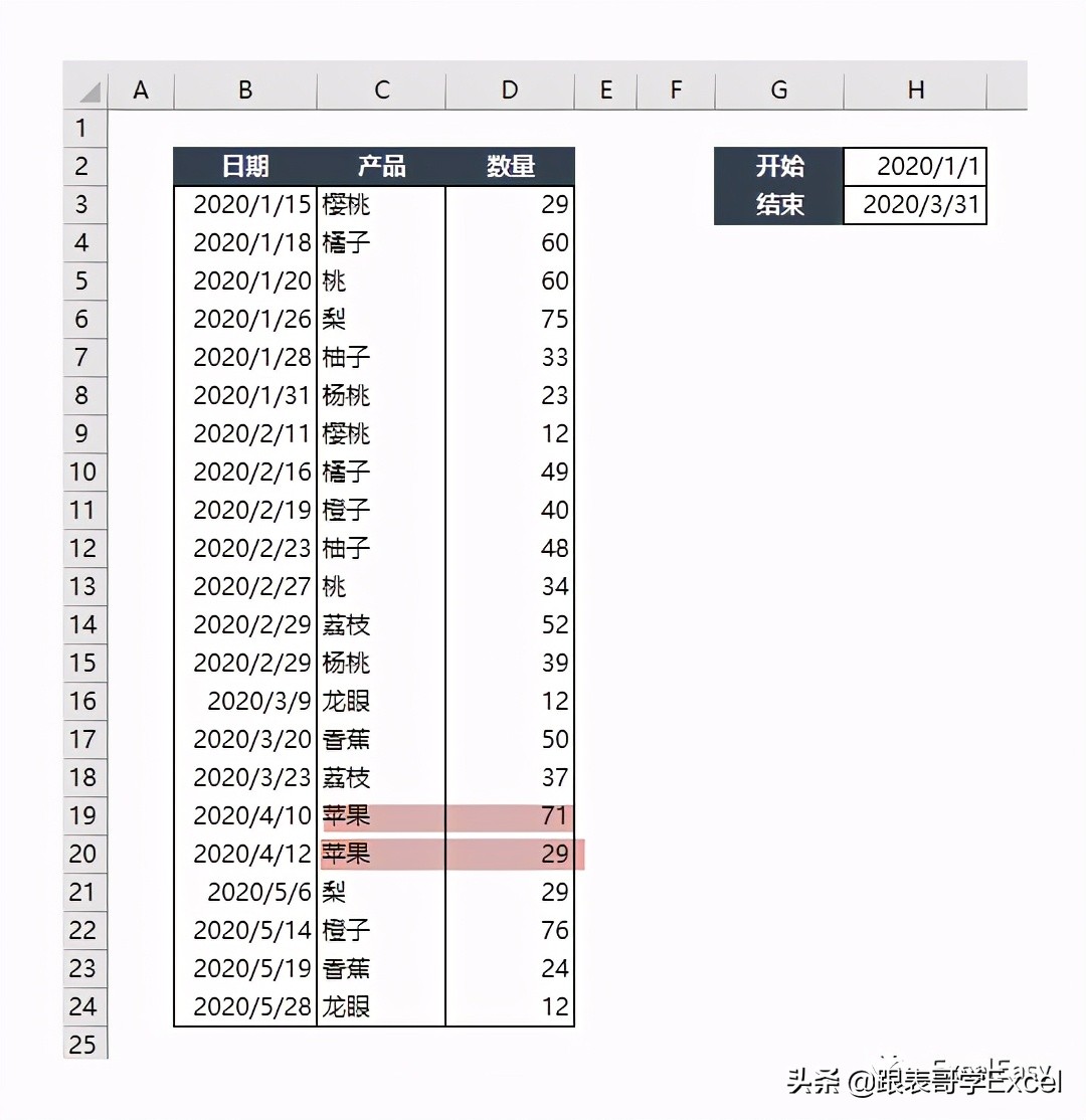 Sumifs函数大家都很熟悉了,用于计算满足一组不同条件的合计。例如,我们希望计算满足给定日期区间内某种产品的销售数量合计:
