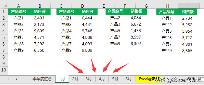 比如:每个月度都有一个销售业绩表,每季度或半年度的数据要统一汇总,如下所示