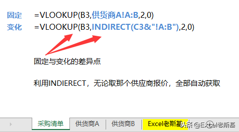 其固定和动态的的区别就在于INDIRECT,利用INDIRECT来获取不同表的内容,这样保障了公式的灵活性,无论选择那家供应商报价,基本无障碍。