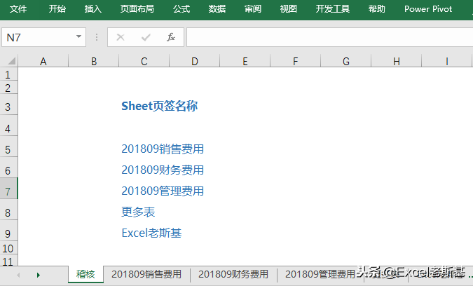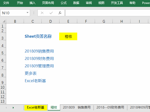 这里的重点是:INDIRECT(C5&"!A1"),C5里面的内容是其中一个页签的名称,所以C5&"!A1"就转化为了201809销售费用!A1,再利用INDIRECT来获取该单元格的内容。