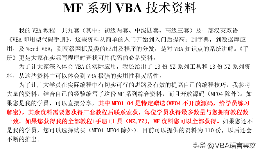 为了更好的完善学员的知识结构,及丰富学员的实践经验,我还会提供给大家更多的VBA工具,有较复杂些的NZ系列工具,较容易些的YZ系列,同时还有MF系列技术资料,MF,YZ,NZ各个系列的工具,在平台上不会公布代码,大家可以根据自己的需要联系我选择。MF系列技术资料侧重VBA应用技巧和疑难杂症,里面有很多实用技巧提供给大家。对于MF系列资料,学员只要获得我所有教程(9套教程+汉英手册)中的三套及以上就可以索获这个系列资料;如果您获得我的全部教程+手册+工具(NZ,YZ),那么您可以获得我提供的所有MF系列技术资料,如果您还不是我的学员,您可以选择分享。今日给大家介绍的是MF系列技术资料MF30:VBA_清除Excel缓存