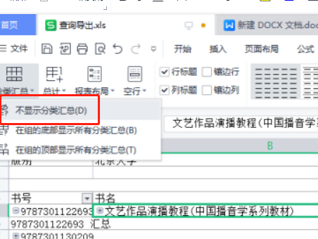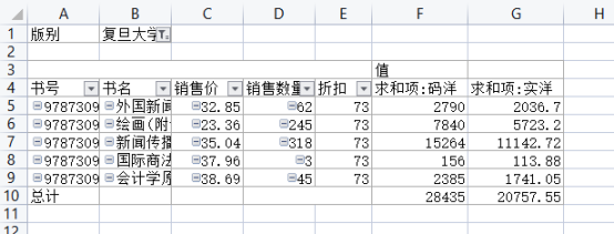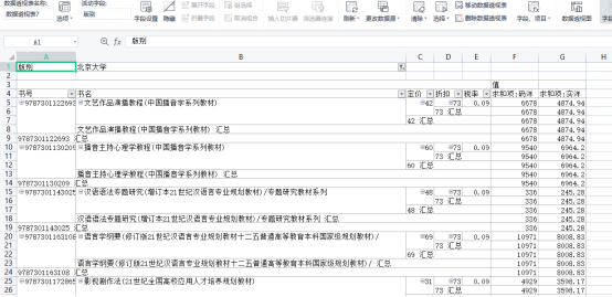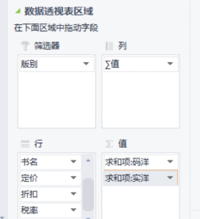 然后,我们在右侧弹出的透视表工作栏中,将希望展示的内容添加到行里边,如果是需要进行四则运算的数据,可以放在值一列,比如这里的码洋、实洋(由于同一本书可能有多条销售记录,所以金额一定是汇总的),确定
