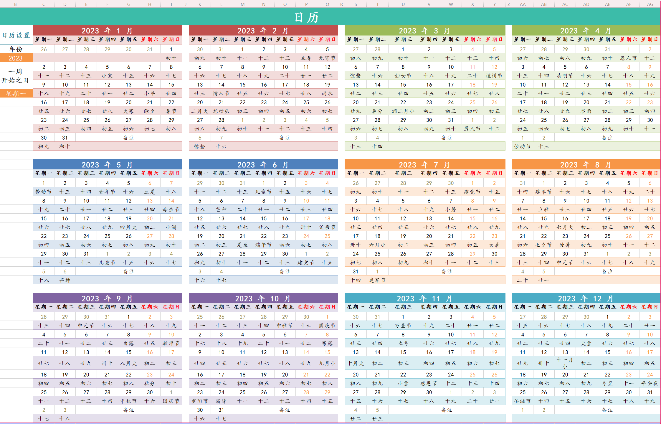 用EXCEL制作动态日历表还是蛮有意思的,今天我们一起来看一看吧,由于字数有限,只展示第一个月的单元格公式,制作好的日历如下: