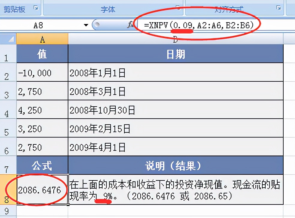 - 如果 dates 中的任一数值不是合法日期,函数 XNPV 返回错误值 #VALUE。