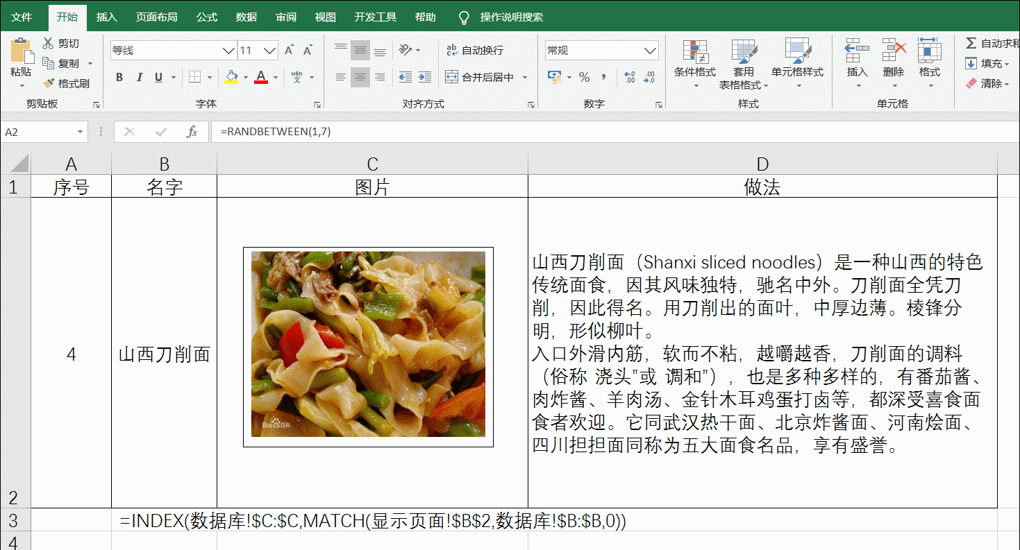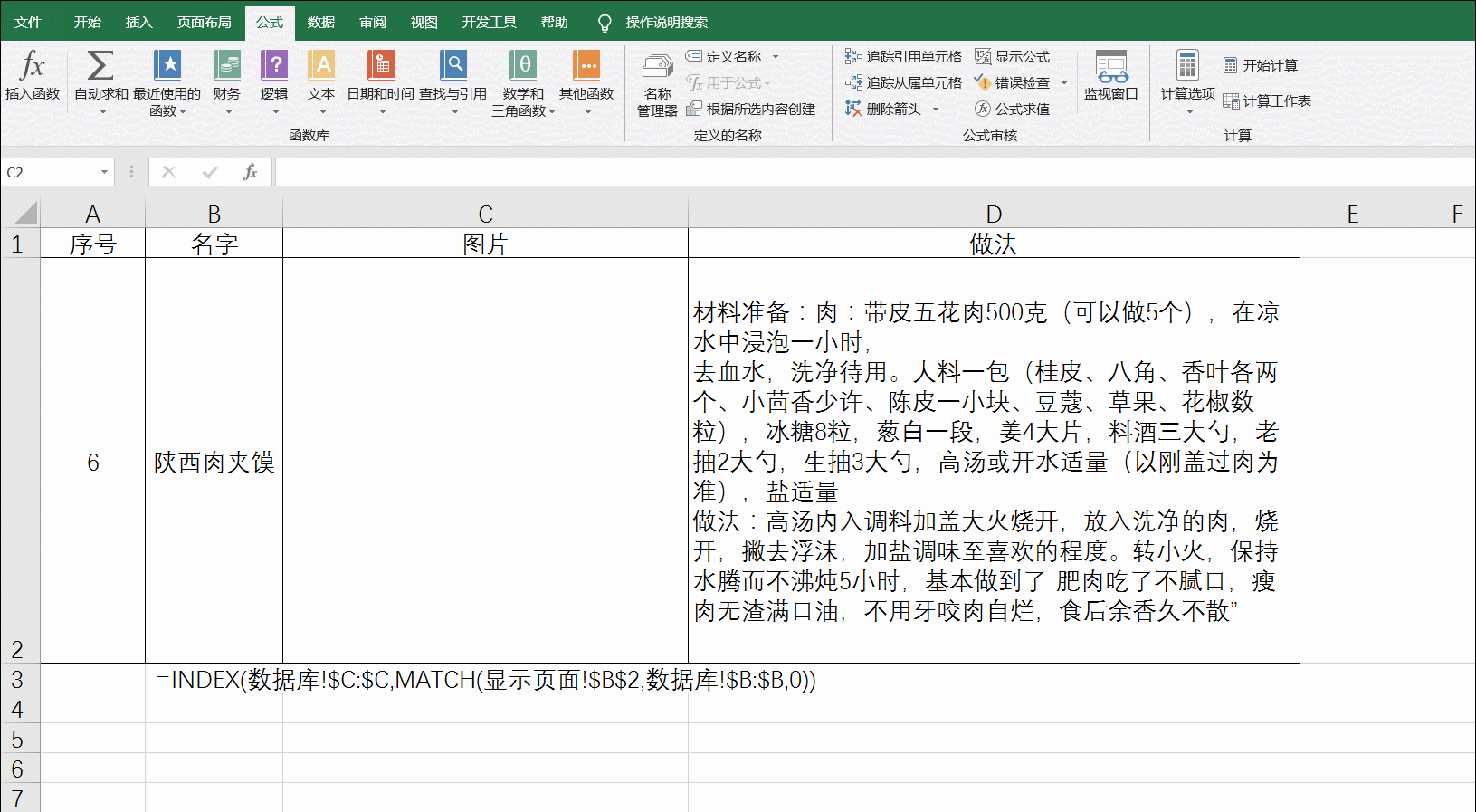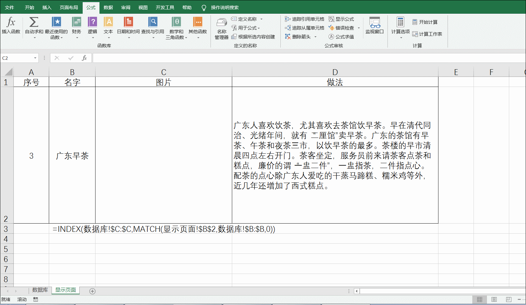 =INDEX(数据库!$C:$C,MATCH(显示页面!$B$2,数据库!$B:$B,0))