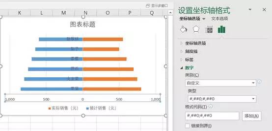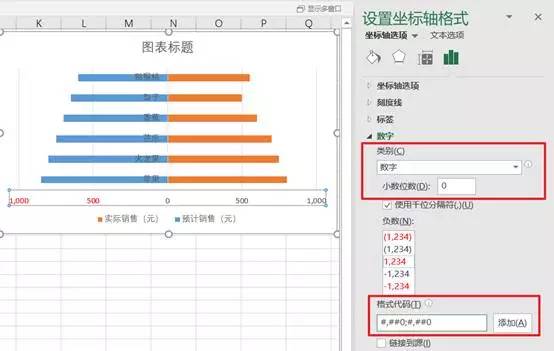 选中X坐标轴,在“设置坐标轴格式—数字”中,将“类别”改为“数字”,“小数位数”设为0,格式代码自定义为:#,##0;#,##0,点击“添加”,完成(图四、图五)。