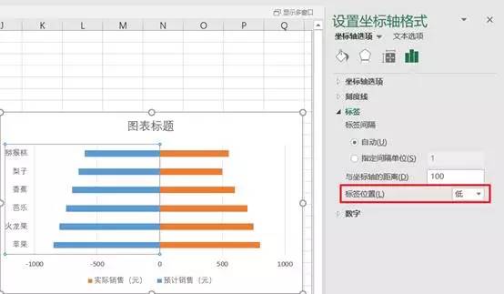 选中坐标轴,在“设置坐标轴格式—标签”中,将“标签位置”设置为“低”(图三):