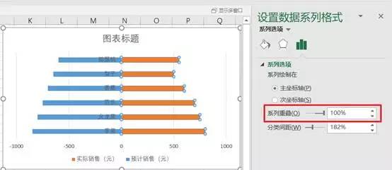 选中图表,在“设置数据系列格式—系列选项”中,将“系列重叠”改为100%(图二):