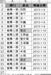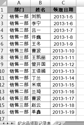 图所示是某企业庆祝销售额突破10亿元大关活动的纪念品领取记录表。为了便于从众 多记录中查看重复领取的员工姓名,可以设置条件格式对重复数据进行凸显,方法如下。