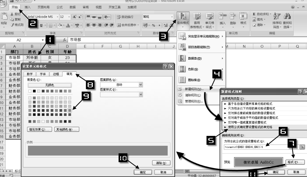 步骤2中的公式使用了COUNTIF函数对姓名字段的出现次数进行了统计,所有超过1次出现 的姓名都将因满足规则而显示特殊的格式。设置完成后的表格如图157-6所示。